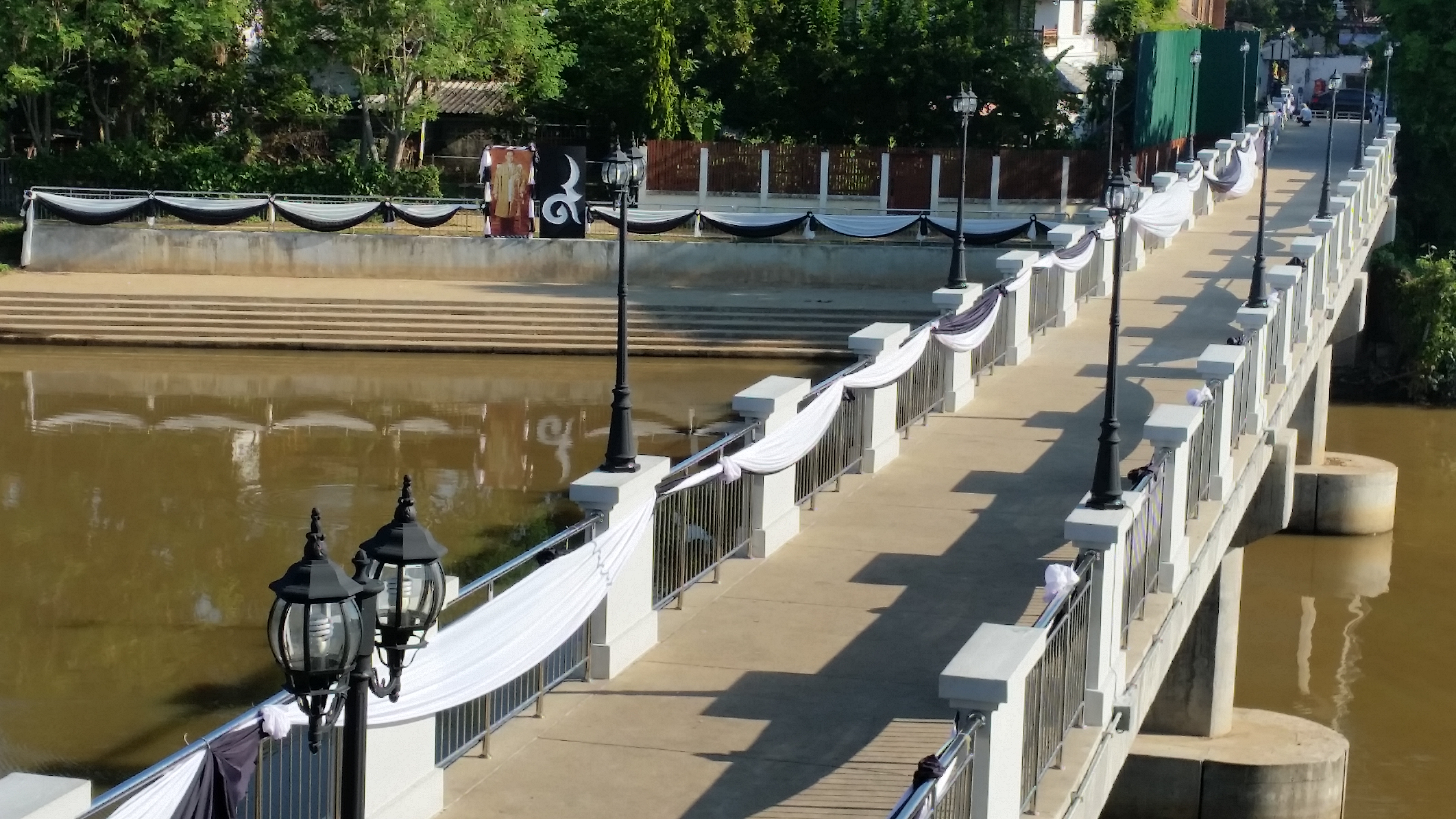 One errand I didn’t manage on arriving in Chiang Mai was satisfying my quest for my favorite Thai peanut snack. It’s a delicious mixture of puffed rice, coconut, peanuts and sugar. Looking out from Wat Ket Karam, I discovered that I was just across the memorial pedestrian bridge to Worowot Market. The cement bridge was originally built by a Chiang Mai governor in honor of his wife. Since then it has been rebuilt twice, once to convert it to concrete and just last year to repair damage. The white cement bridge is bedecked in the black and white bunting to honor the King. A quick stroll through the market paid off and I procured my peanut yummy goodness (not even a translation of the name.)