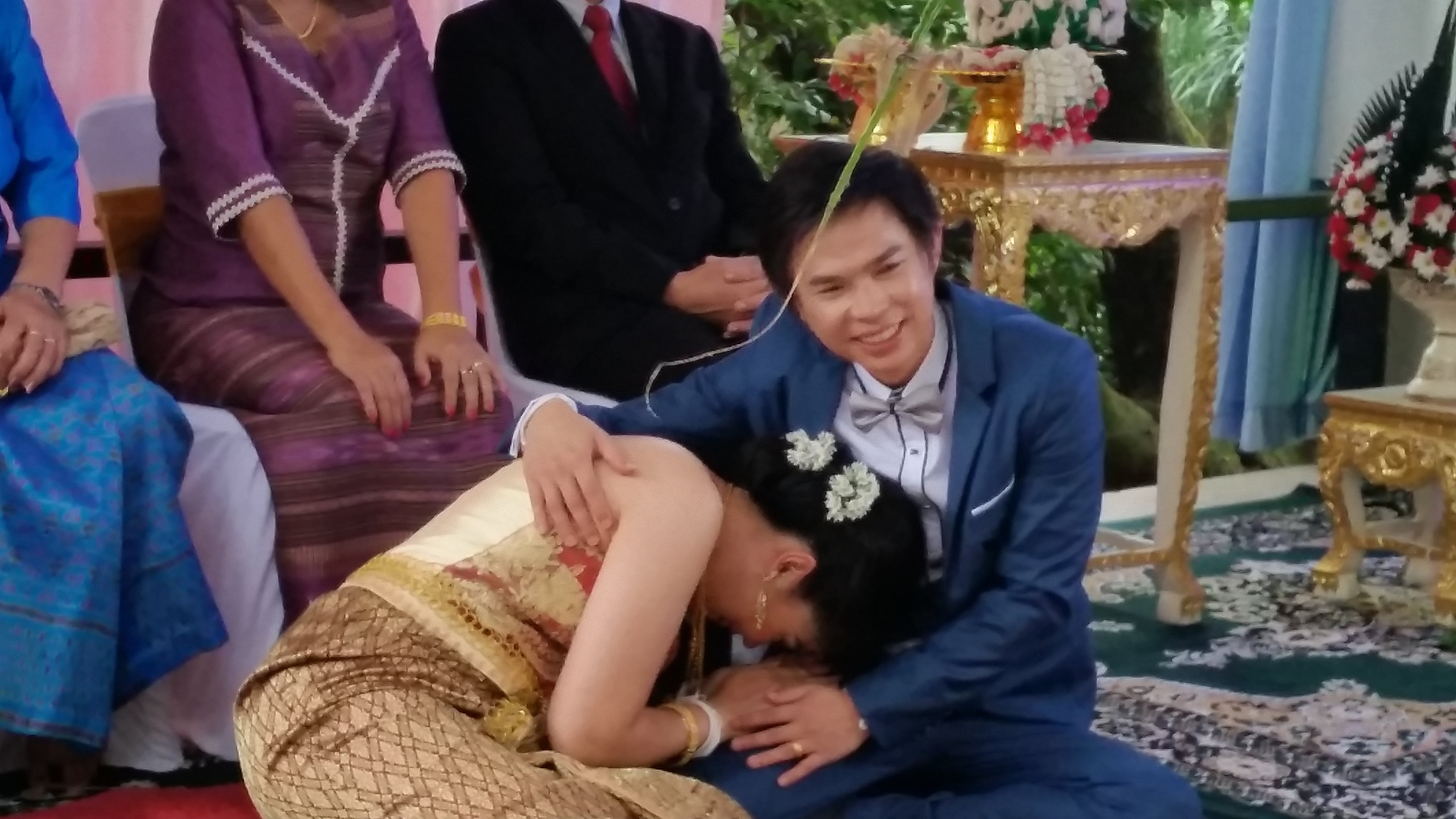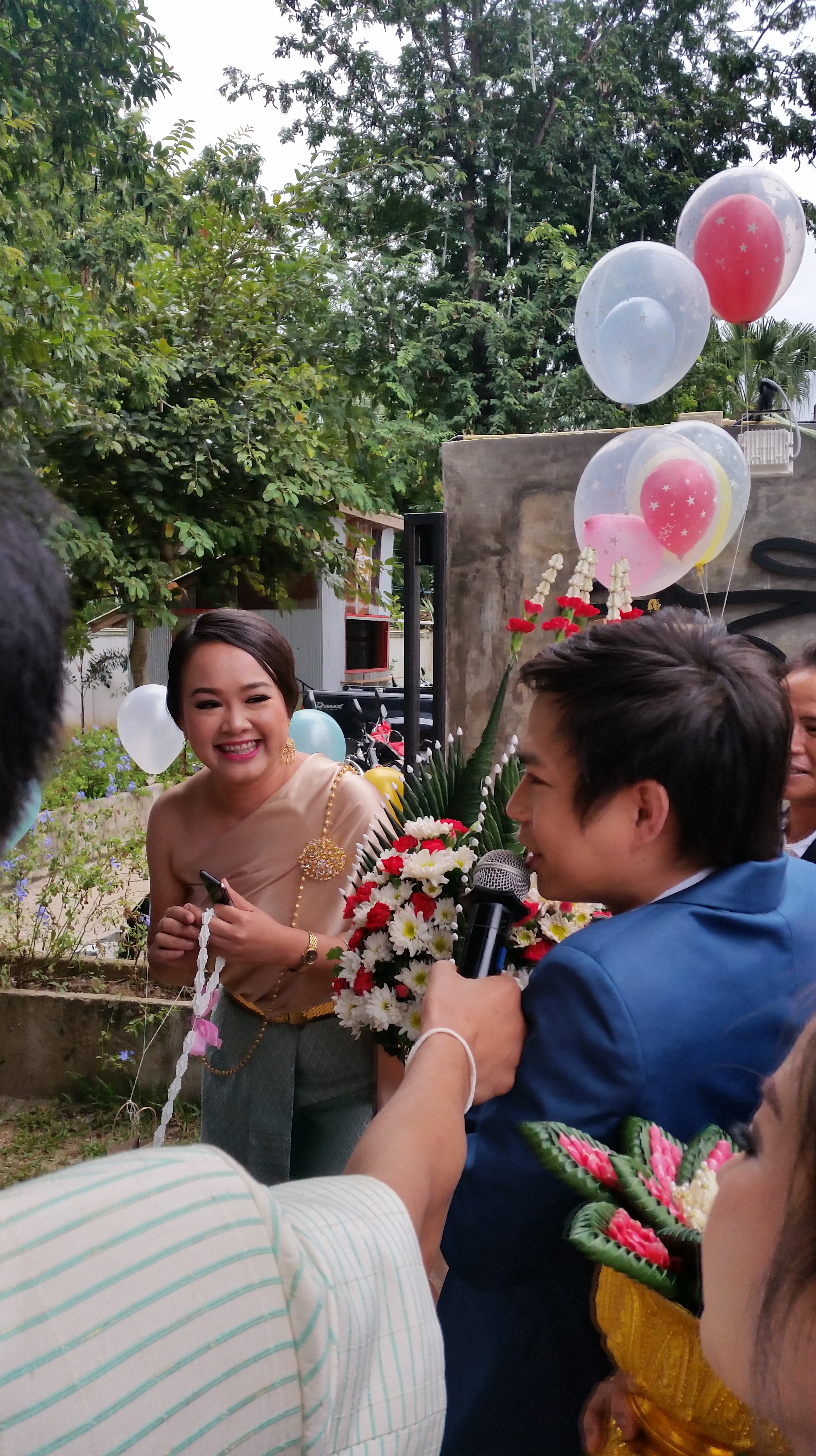The dias had been transformed for the second half of the ceremony. The monk chairs had been removed. Chairs had been placed in a row and the kneeling benches had been arranged for the couple under the F & C sign that had green and white bunting draped behind it. The bride, groom and parents took their places on the dias, parents on the chairs and the couple on the ground. The children paid honor to the parents, first to their own parents, then to the other’s parents. The dowry was officially passed from Chai’s father to Fai’s father. Then Chai put the necklace, bracelet and ring on Fai. She placed his ring on his finger. And at the end, she bowed to Chai, placing her hands on his leg and her forehead to her hands, while Chai wrapped his arm around her. After a final blessing, from what I would interpret as a welcoming to the family, the couple took their place on the kneeling benches. First they received three blessing dots in gold on their forehead. Garlands of small white flowers were placed on their head, the garlands connected with a string of small flowers. Matching flowers on ribbons were placed around their necks. Once they were ready, the VIP guests were invited to come forward and wrap a blessing string around their wrists. A literal tying of the knot. The string symbolizes the binding of everyone together in a collective family. As one of the VIP, I was honored to get to put a blessing string around my friend’s wrist.