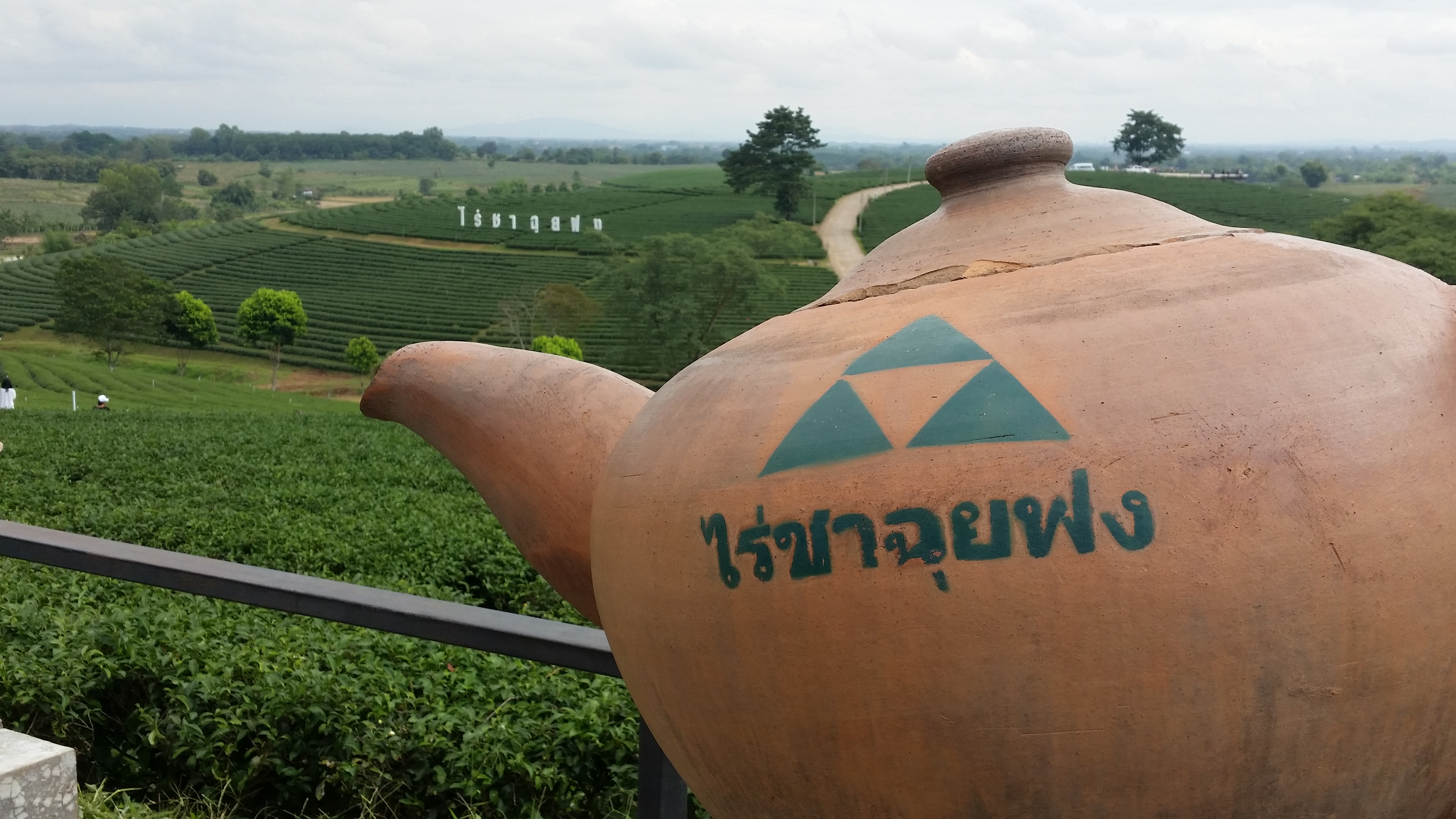 The woman selling pauk se (steamed buns filled with either pork and egg or sweet bean paste) smiled at me as I walked by. I don’t think many of the tourists that come to Mae Sai on the Golden Triangle Tours or for their visa runs (a trip over the border to renew the 30-day Thai visa on entry), make it as far back into the neighborhoods as where I was staying. I continued on into town, stopping at the Chinese temple, apparently dedicated to frogs as far as I could tell from the statuary, along main street for a quick look around. On my walk, Chai did call to make sure that I had managed to get food and to confirm that we would be leaving around noon. Assuring him that I was fine, I continued my stroll for a bit. A little later, Chai called again to inform me that plans had changed and that we would be leaving in 20 minutes because Fai’s family wanted to stop at a tea farm for pictures on the way to the airport. In a humorous exchange where Chai wanted to come get me on the motorbike and me explaining that I had no idea what street I was on but that I wasn’t far from the guesthouse, I assured him I would be back in less than 20 minutes. Picking up my pace from a meander to a walk, I stopped for Thai iced tea and 2 pauk se (one pork and one sweet bean paste), and made it back to Fai’s house in 12 minutes.