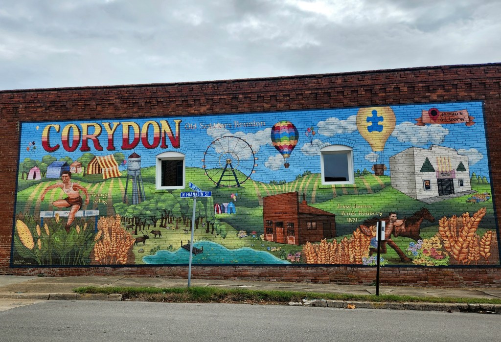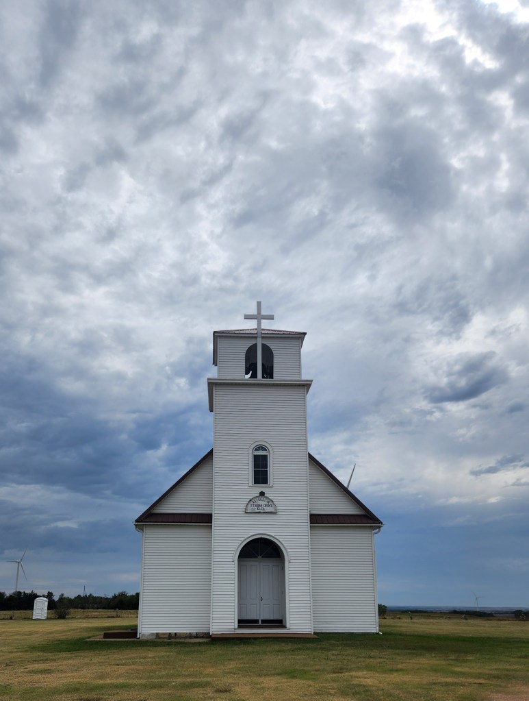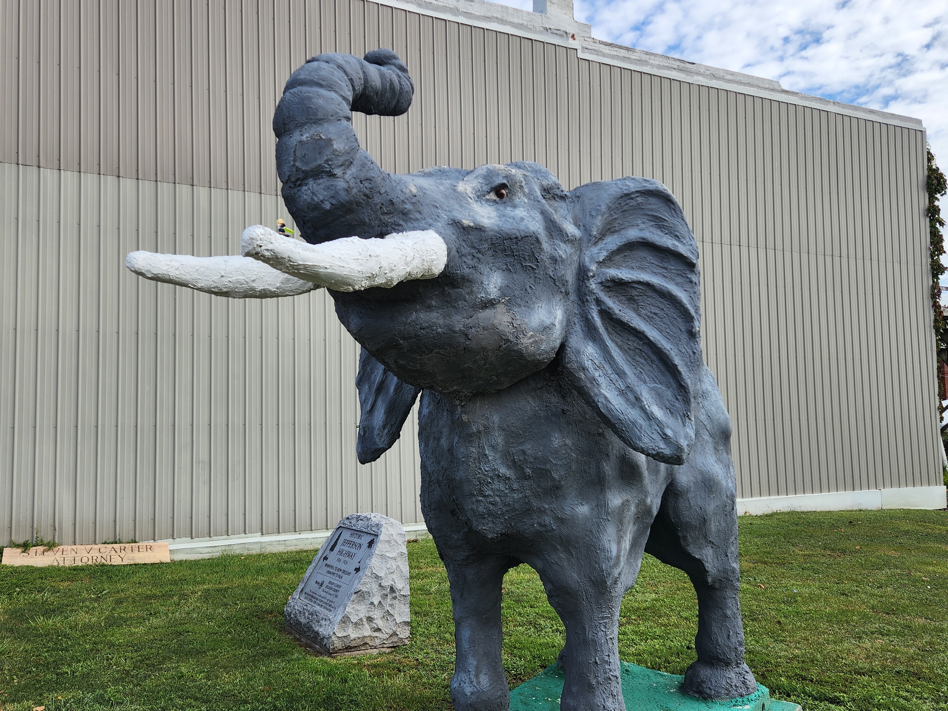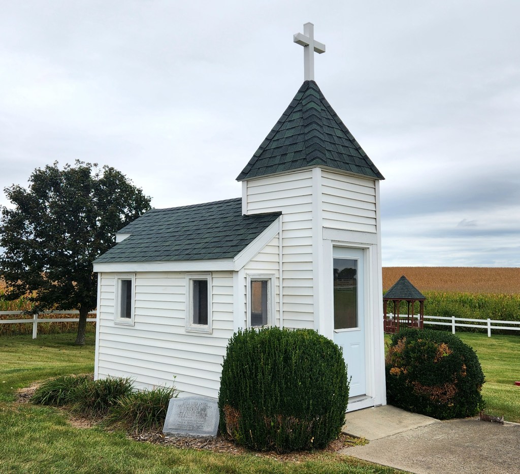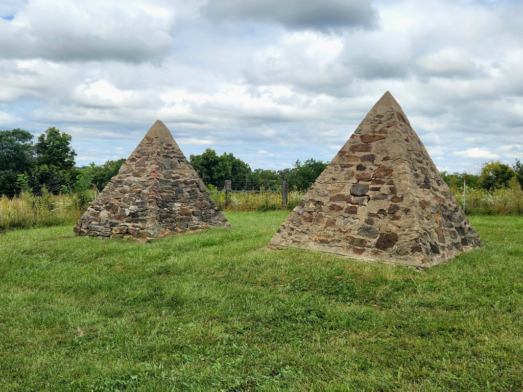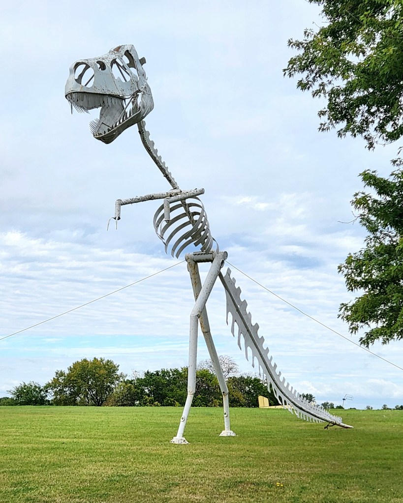 Day four of my road trip through the heartland brought me clear blue skies and had me heading more directly north on I-35, passing over the Iowa state line and then heading east to start my zigzag path through southeastern Iowa. In Leon, I found an old elephant statue standing on the corner. I paused at the mural in Corydon, learning that it was the site of a Jesse James robbery, and came to a screeching halt when I found the white metal dinosaur skeletons standing by the side of the road. Little Flock Chapel stands at an intersection near Plano, the diminutive building painted in white and looking picturesque among the green fields. Heading northeast, I stopped in Avery where there are pyramid shaped tombs that look distinctly out of place in the small cemetery along the gravel road.