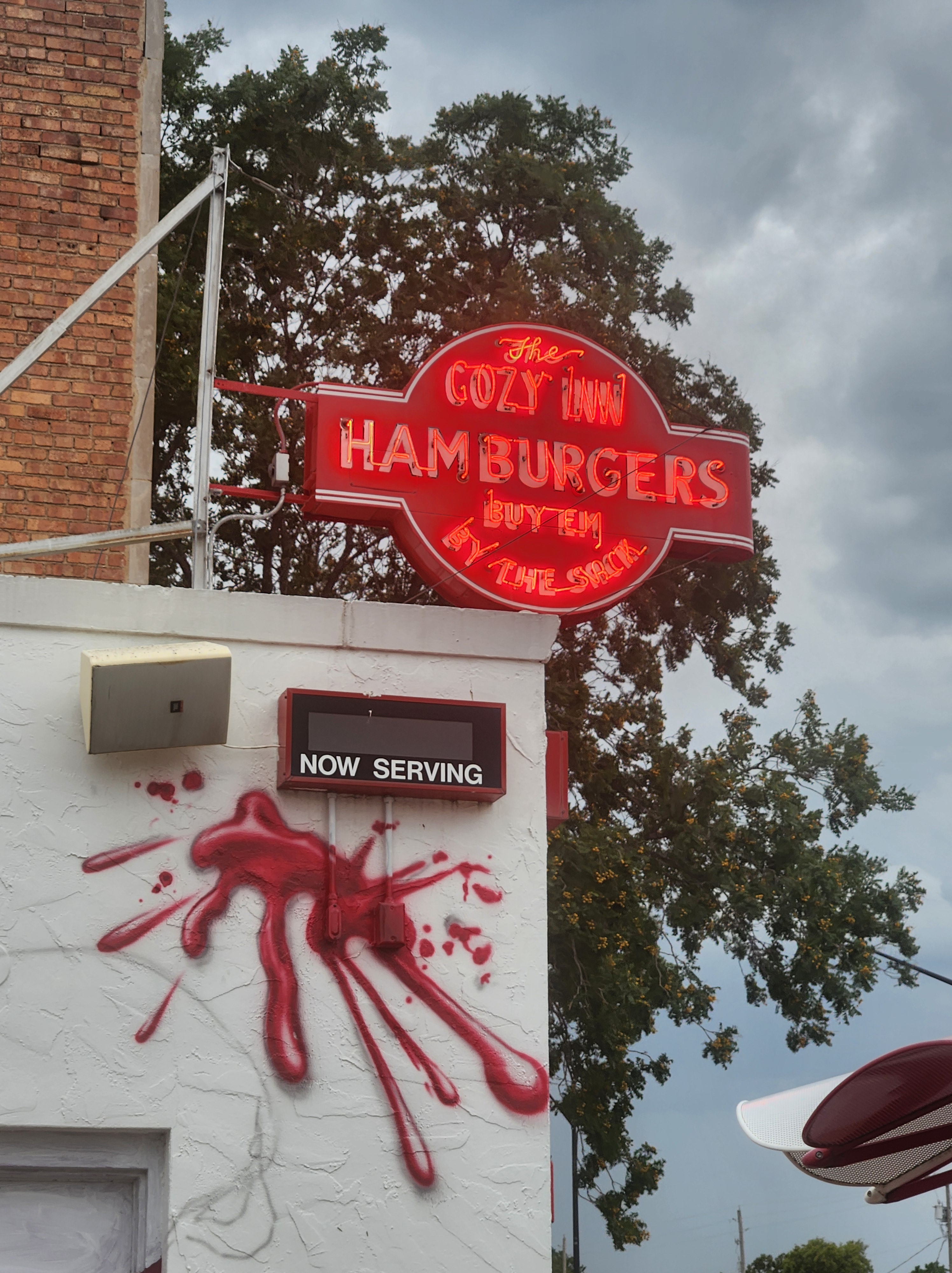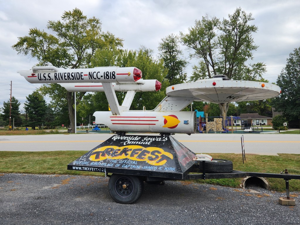 Zig zagging my way northeastwardly brought me to Hal Collier’s Sign Extravaganza outside of Keota. After an affectionate greeting by Mindy Lou, the old and gentle host dog, I took a stroll around the property where every farm building was covered with signs of all manner, and listened to the old metal gas signs creak in the wind as they stood by their accompanying gas pumps. At Hal’s encouraging, I took a tour of the inside of the garage which was filled to the brim with even more signs. Pressing onward and knowing I was close to my destination, I stopped in Riverside. Despite living less than 20 miles from Riverside in my youth, I had never stopped at the future birthplace of Captain James T. Kirk.