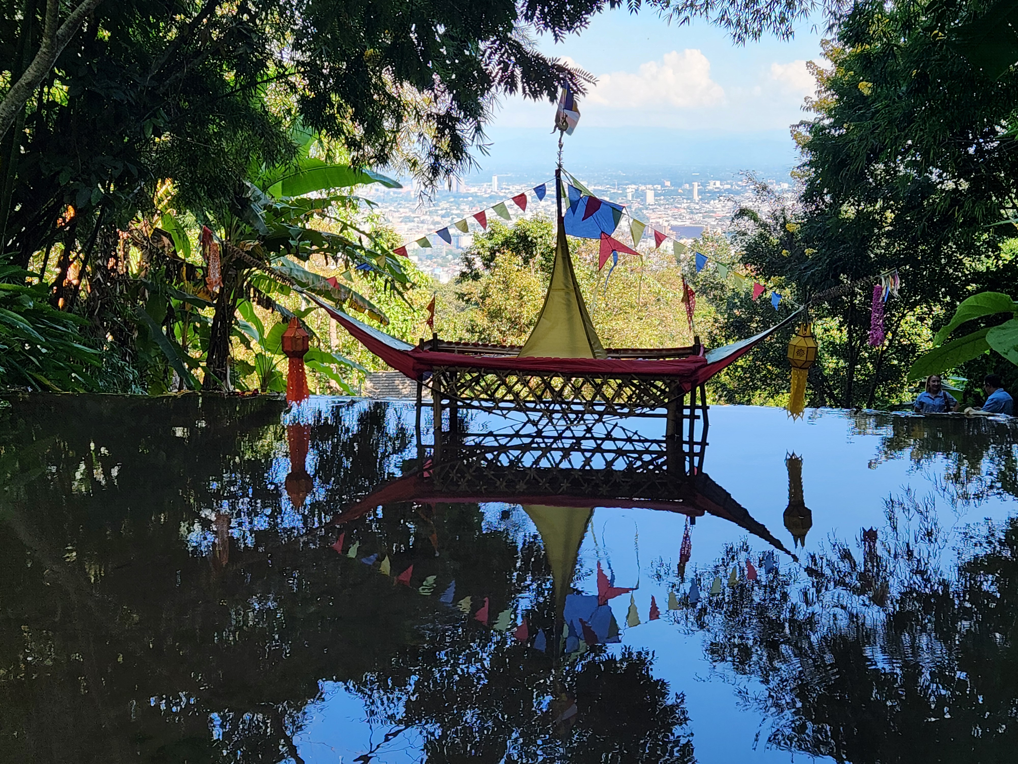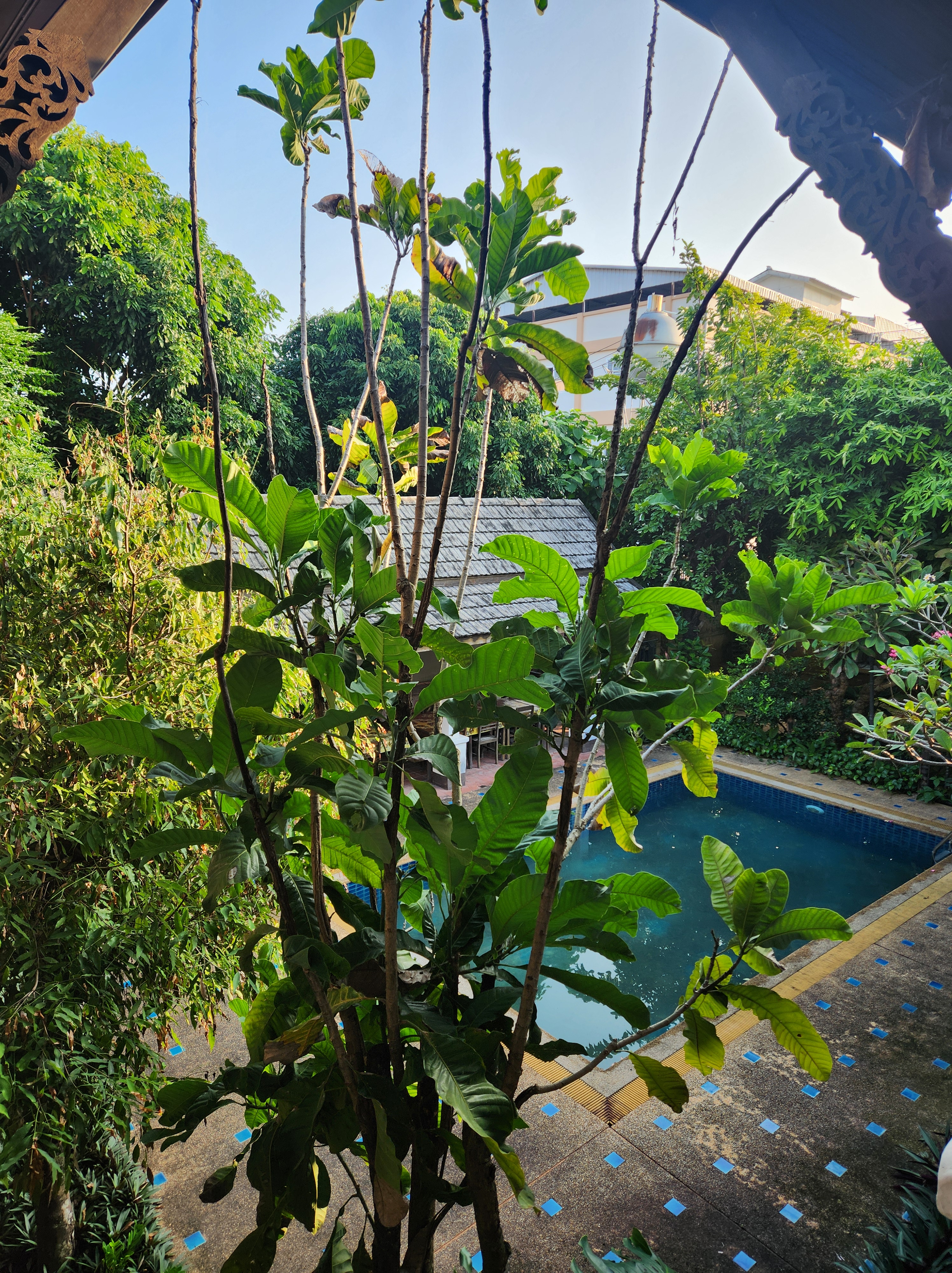 My first hotel was the Royal Shilton Resort. The Royal Shilton Resort is quaint and pleasant. A couple of buildings and two pools, tucked back down a soi (alley) away from the noise and traffic of Huay Keaw road. The lush trees and plants that line the moss covered pavers leading to the room are lovely, despite making for a moderately tricky walk on the slippery stones. The pool in the courtyard closest to my room is uninviting, with muck and leaves at the bottom. The four poster bed with mosquito netting, tied back as the bed curtains, is adorned in a sheet set that looks more like a mattress pad covering an ultra-firm mattress, even by Asian standards, with two equally firm pillows. Locating a comforter in the cupboard and folded in fourths made the bed some version of soft enough to get some sleep.
