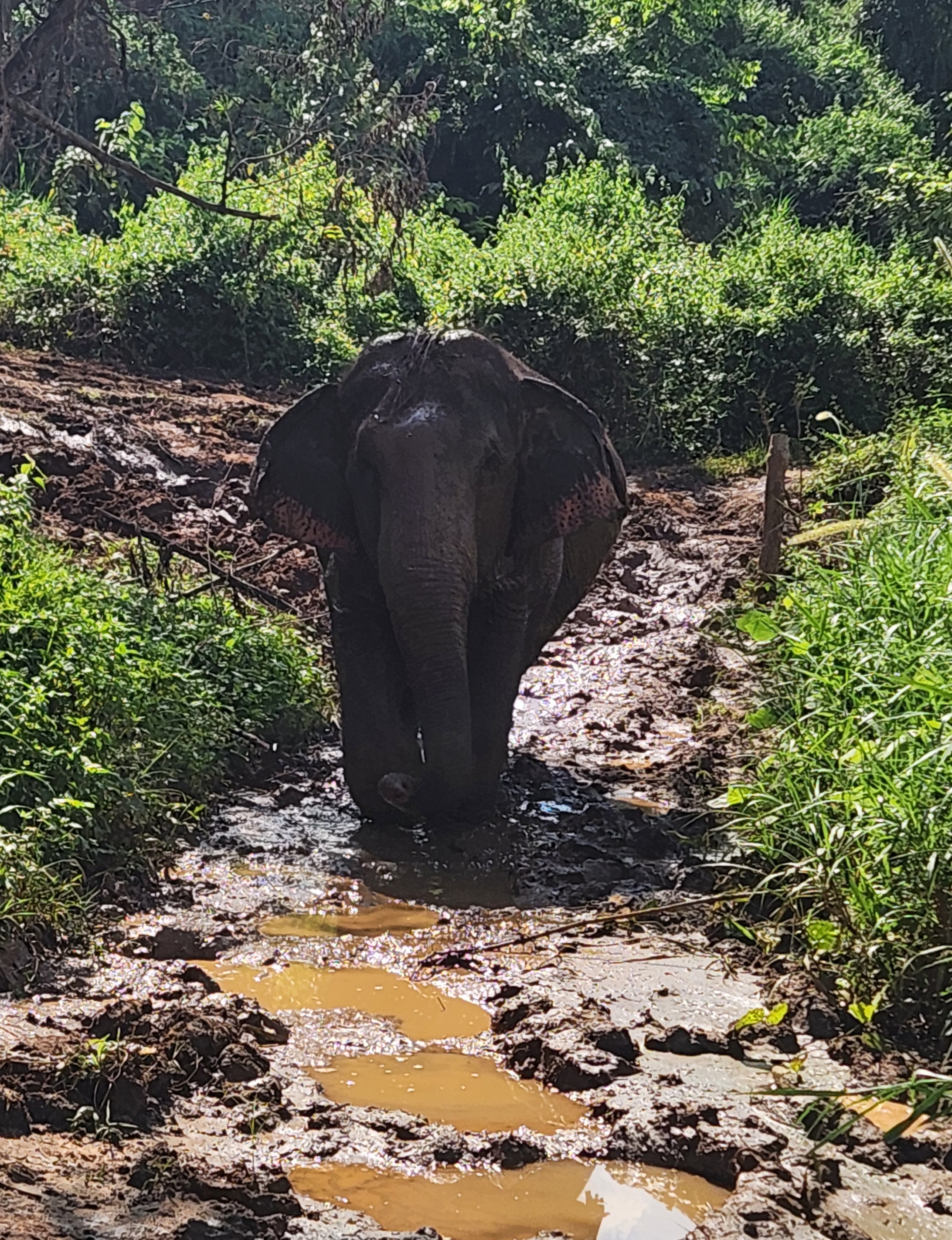 Typically, after bath time is mud pit time. Elephants use mud and dirt as insect repellent and sunscreen. Today, the ladies didn’t feel like having a mud spa treatment. Maybe because they are tired of mud and rain with all that they have had this year so far and Sunday being the first day it hadn’t rained in a long time. The elephants at Happy Elephant Home get to choose what they want to do and are never forced to do something they don’t want to do as an activity for the tourists.