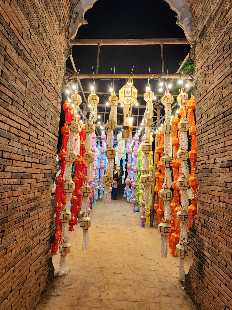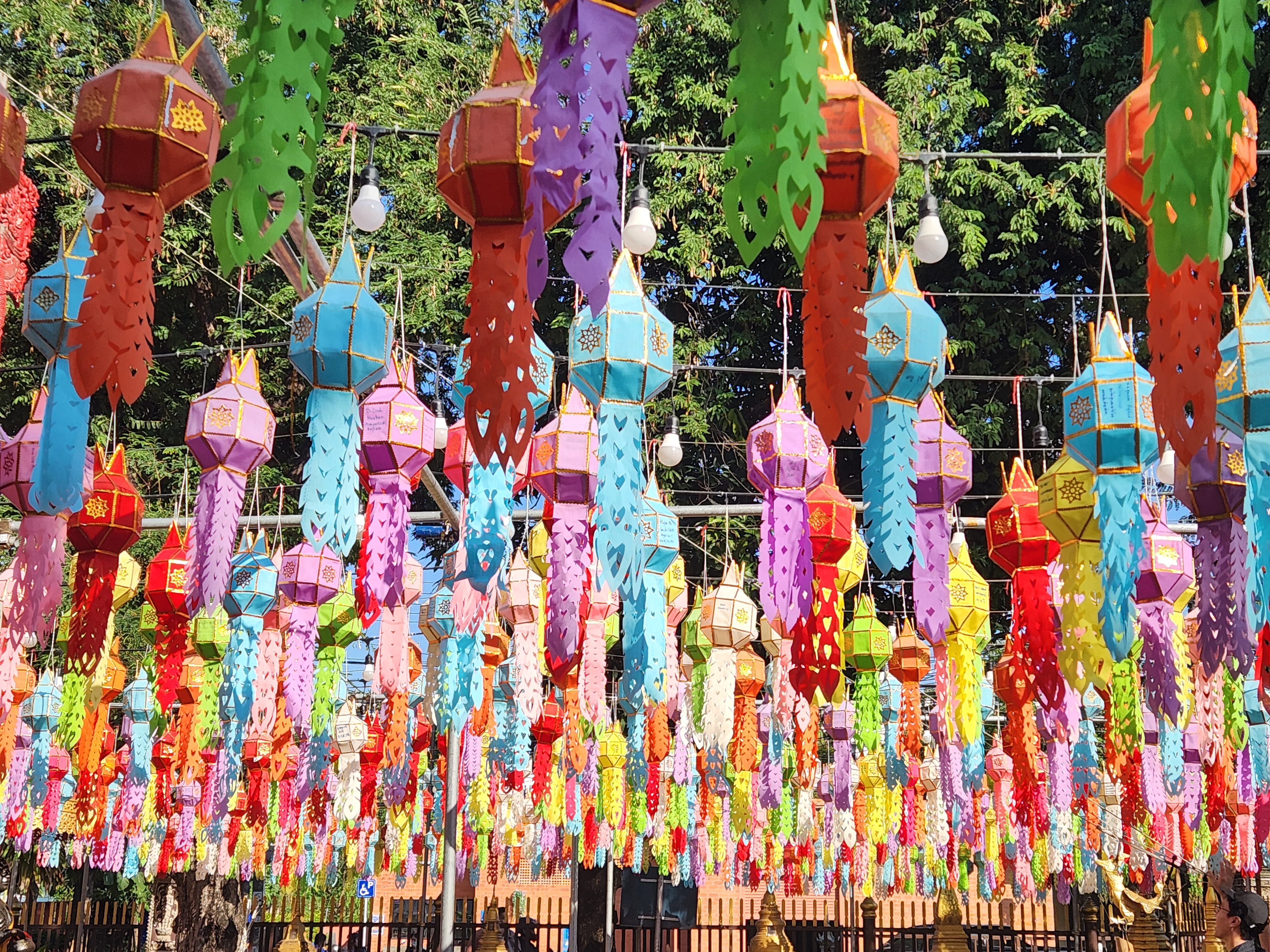 Festival time in Chiang Mai has the city illuminated with lanterns. Every temple has hundreds of paper lanterns offering wishes hanging on the trees and scaffolding erected just to hold them. Trees and business have decorative lanterns. The city is alive with color and light.