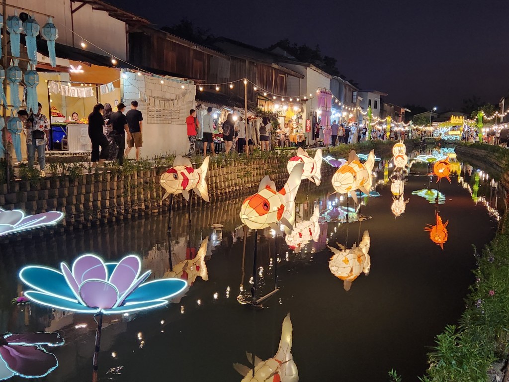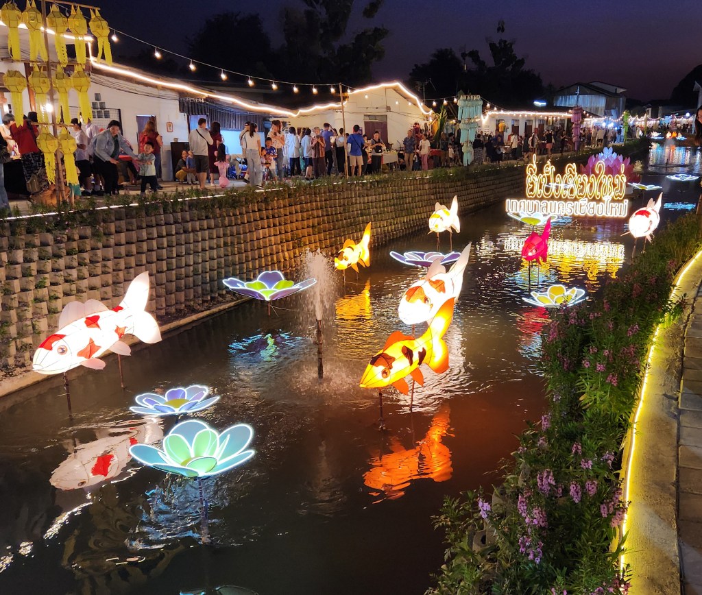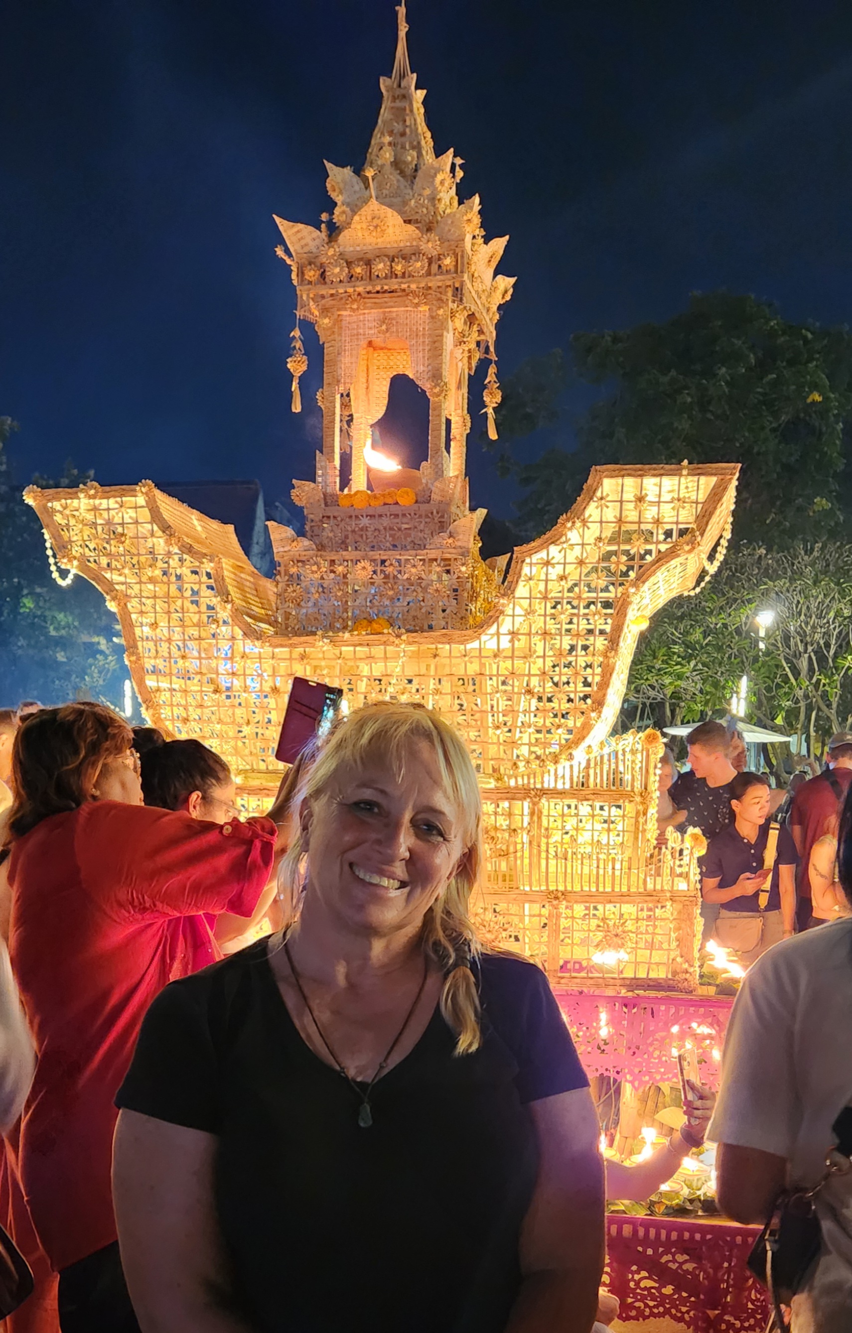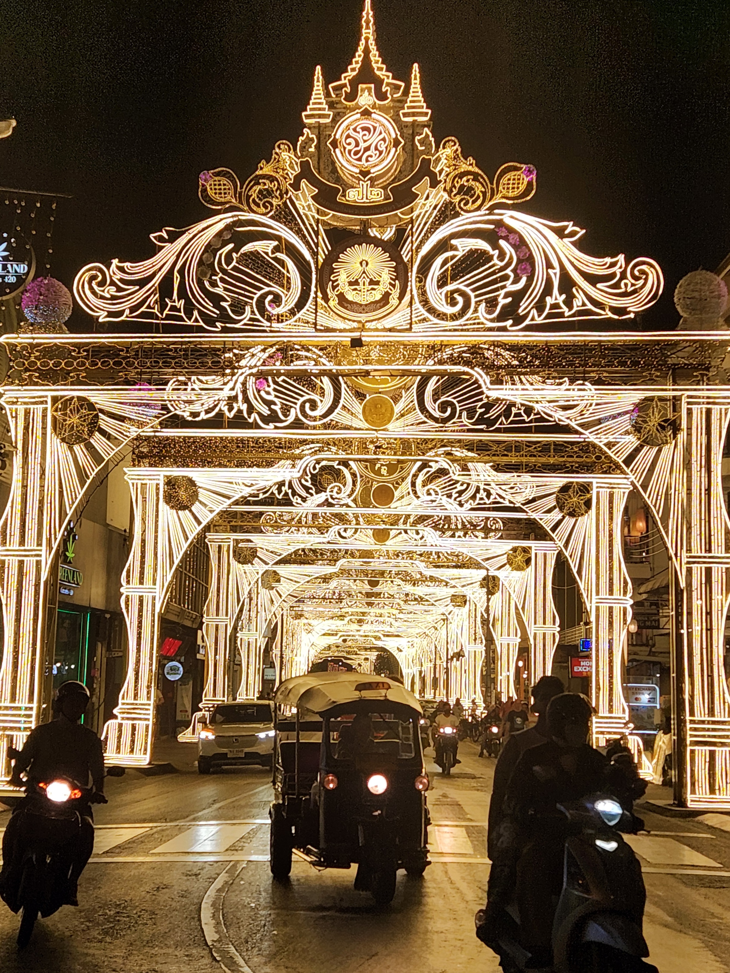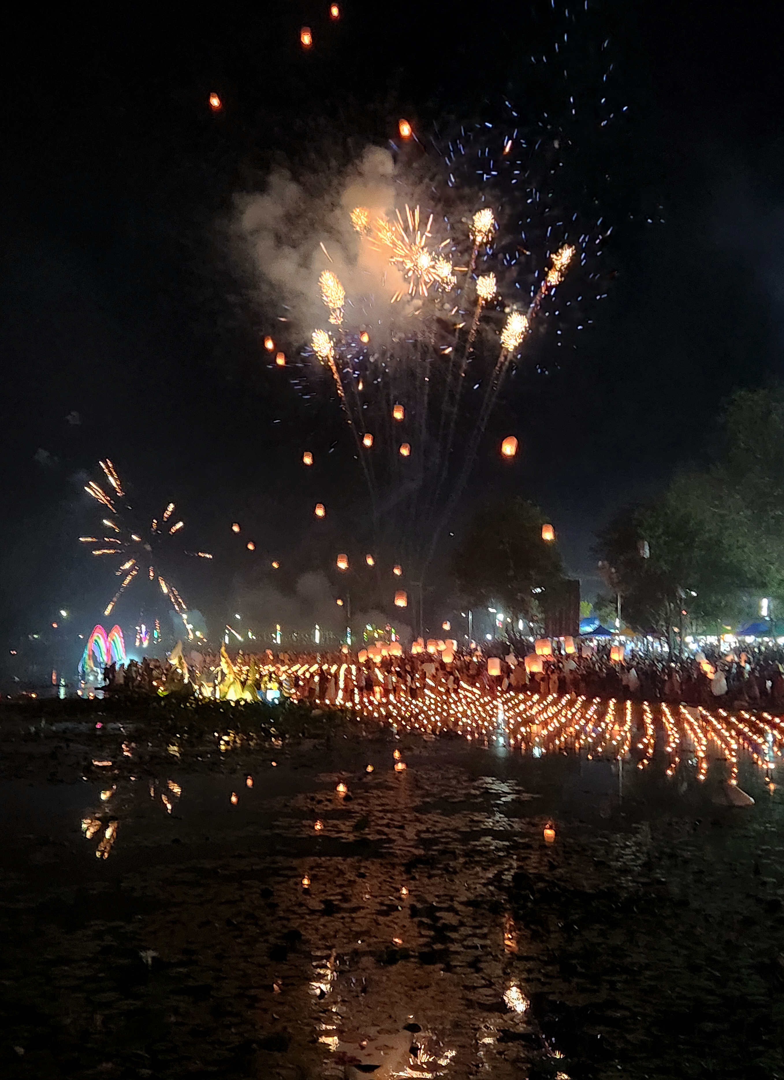 Klong Mae Kha was the perfect location. The canal was embellished with illuminated decorations of giant fish and lotus flowers reflecting in the water. The bridges over the canal were adorned with lights, lanterns, and giant butterfly wings. All along each side of the canal were stalls selling goods, food, beer, and krathongs (the small floating offerings made of banana leaves with flowers, incense, and a candle.) We found a bar, ordered beer, and got to know each other through conversation and laughter.