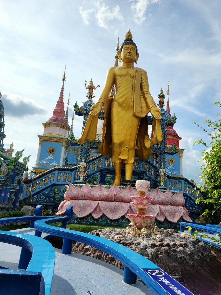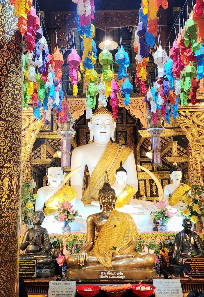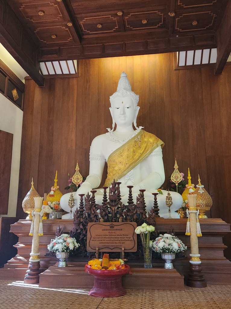 On my way to Wat Pan Whean, I stopped into a store that was selling skirts. Now that I was in possession of a garment to cover my knees, I walked back across the Old Town to Wat Inthakhin Sadue Muang so I could properly visit. Entering the Vishara (main temple building), I followed proper Thai custom, kneeling and bowing 3 times, each time touching my forehead to the ground. After saying my prayers and wishes, I made merit to the Tuesday Buddha to help my life. Each day of the week has a Buddha (Wednesday has two for some reason). Part of the practice is to make merit to the Buddha for the day you were born to help your life.