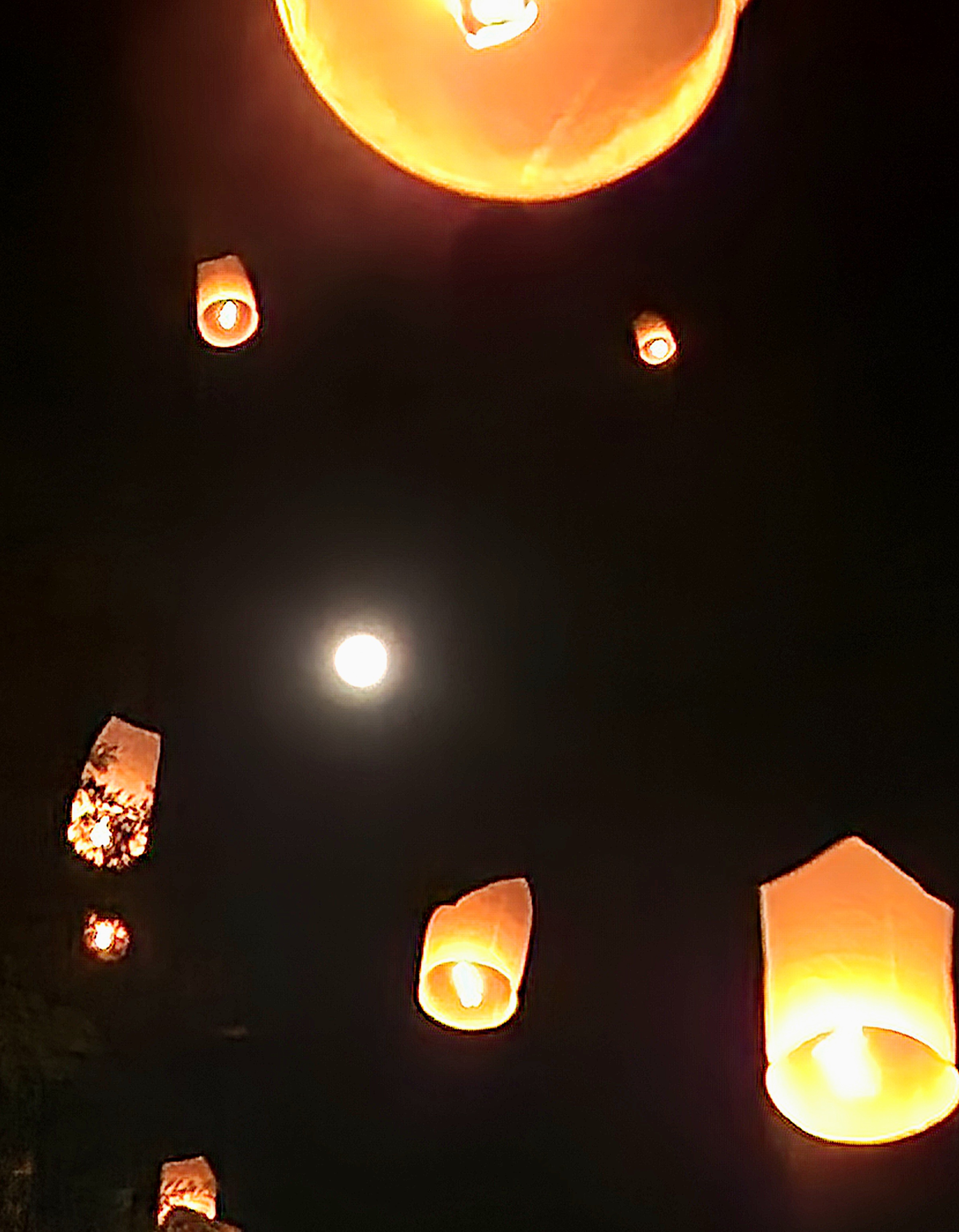 Lighting a khom loy is a group effort. They are constructed with rice paper and have a paraffin soaked disc that you light. Once you manage to get the disc light, you hold the lantern until it is filled with hot air. The temptation is great to release the lantern too soon, which makes for a difficult journey skyward and often ends up with the lantern stuck in one of the trees at the edge of the grassy area.