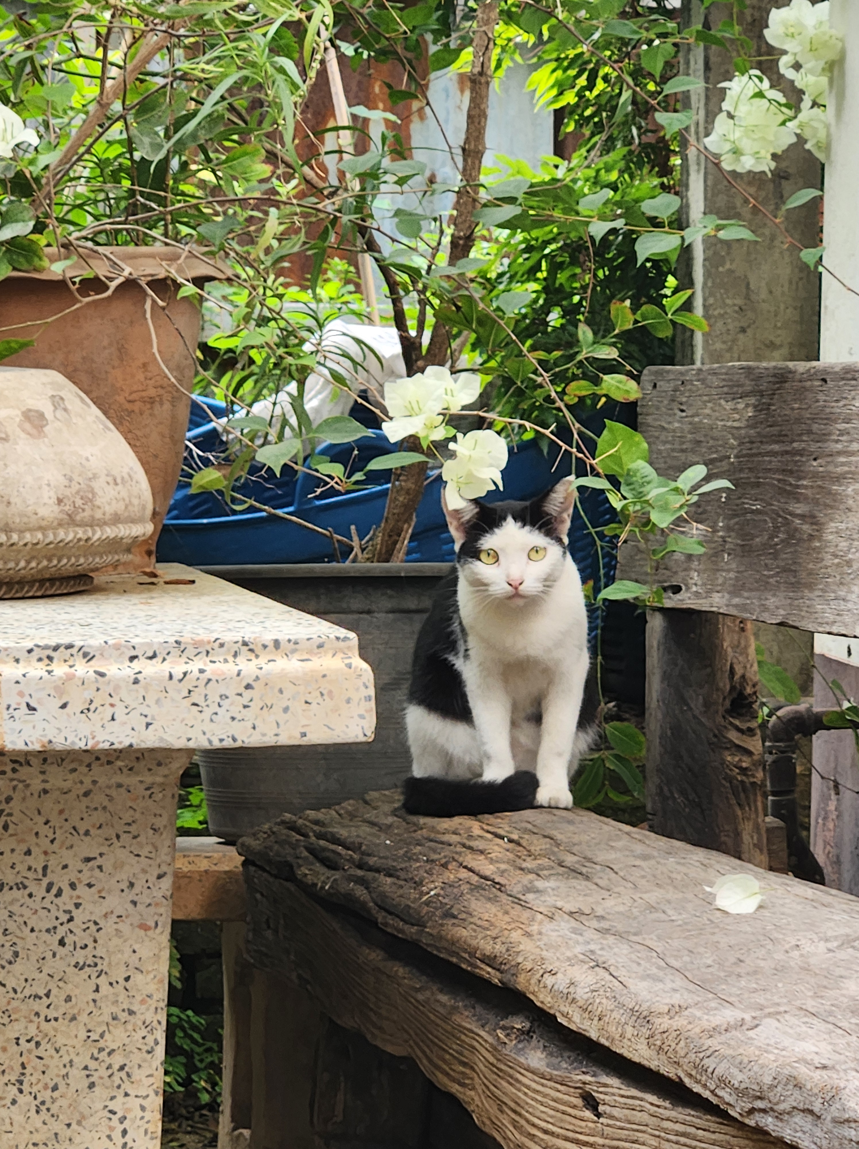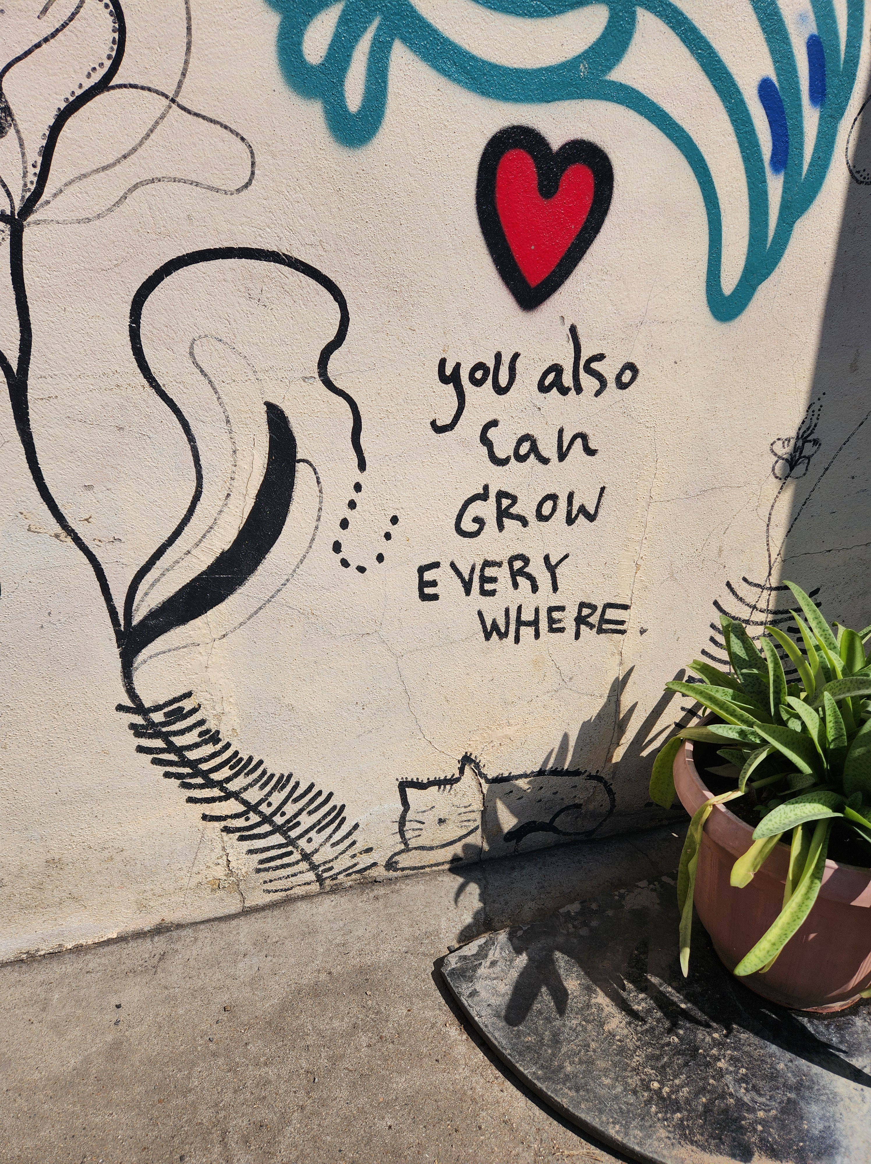 Despite the obstacle course, I still enjoy walking and seeing the random little things that often go unnoticed when on a motorbike or when one is in a hurry to get to a destination. An old mile marker. Flowers against a brick wall. Watching the traffic zip by ancient buildings. A lovely message painted on a building. Along the way, I smile at the Thai and the other farang (foreigners), most the Thai and occasionally a few farang return smiles, which makes me happy. I also am enjoying the healthy benefits of walking everywhere. My legs are continuing to grow stronger with each step.