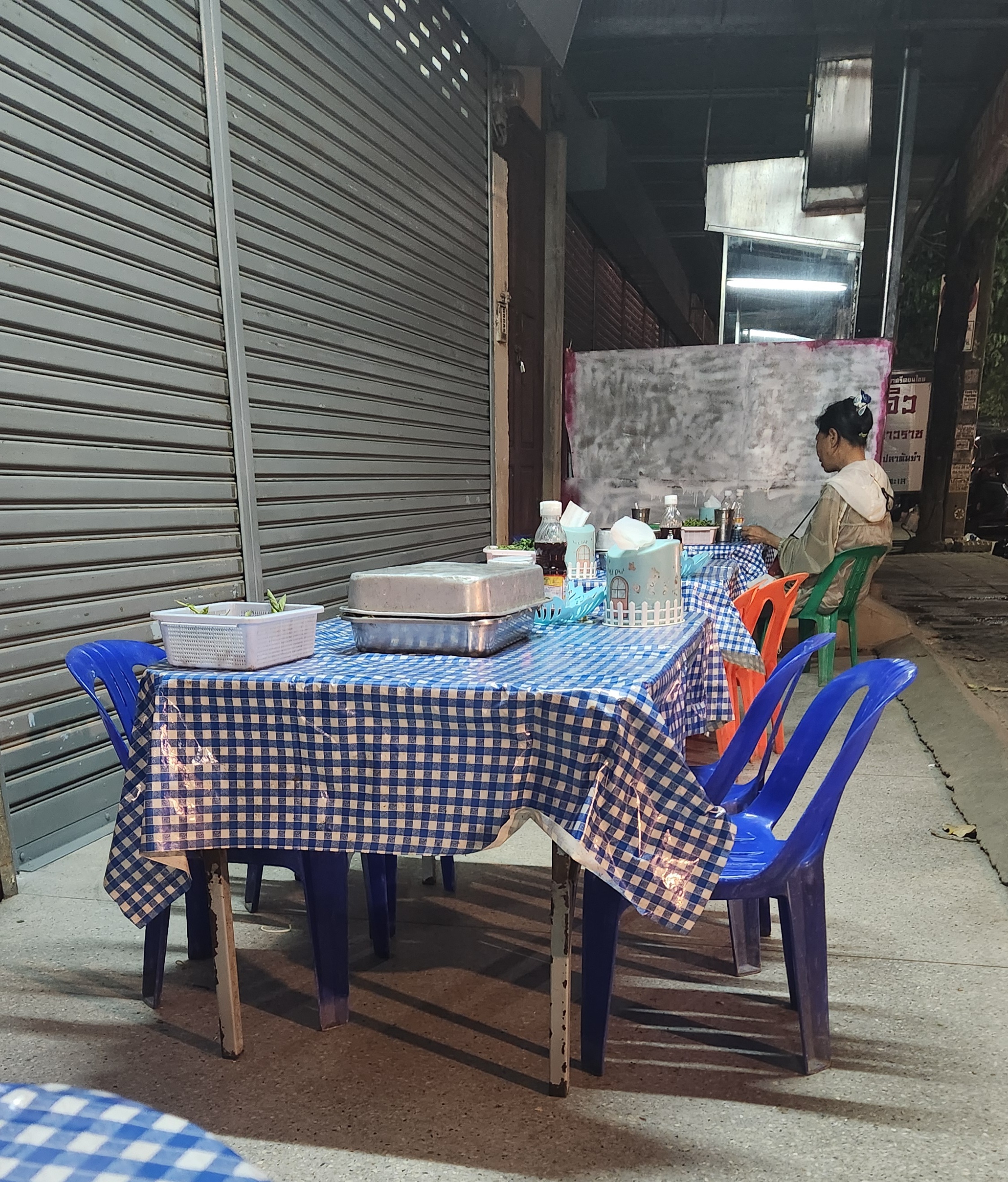 We started at a Japanese restaurant for what we called dinner number 2. Per my usual, I had no idea what some of what I was eating was. Maybe squid. I don’t know. We did also have some more recognizable foods like salmon, chicken, and pork. Since I had never had mala before, Chai decided we should go on to a mala shop for dinner number 3. For mala, you pick out some various meats on a a stick, they grill it, and then serve it in a soup that we shared. Since I am a farang, I’m pretty sure they made it less spicy than normal. While at the mala place, I was telling Chai about my night with Lek. In Chai’s opinion, the vendor on the corner that has been there for many years, makes the dish even better than Sankapoi. And with that, we were on to dinner number 4. Served by a stern woman that never smiled or showed any emotion and sitting at tables and chairs more suited to children size people. Did I mention Thai like to eat?
