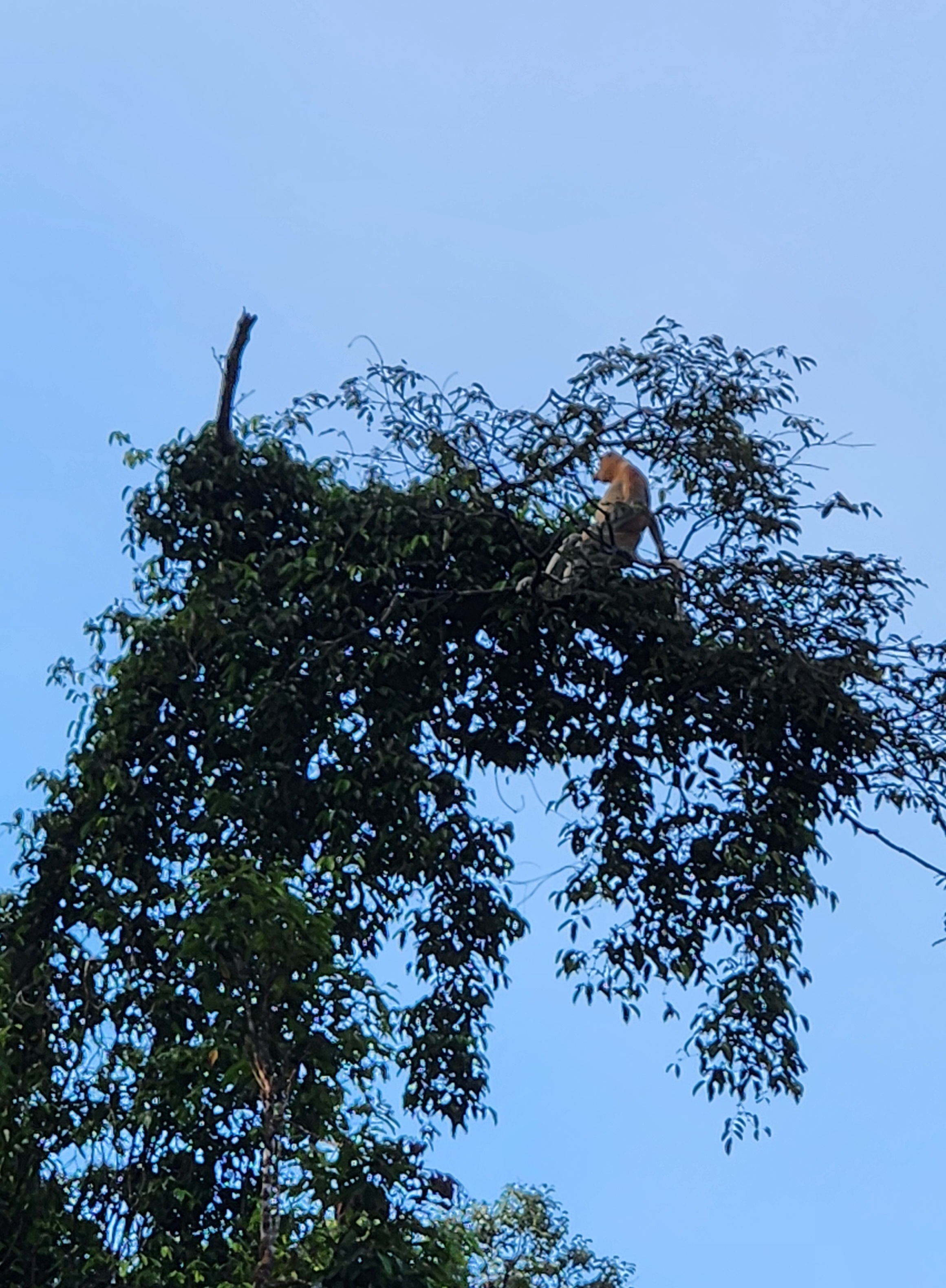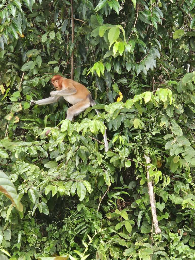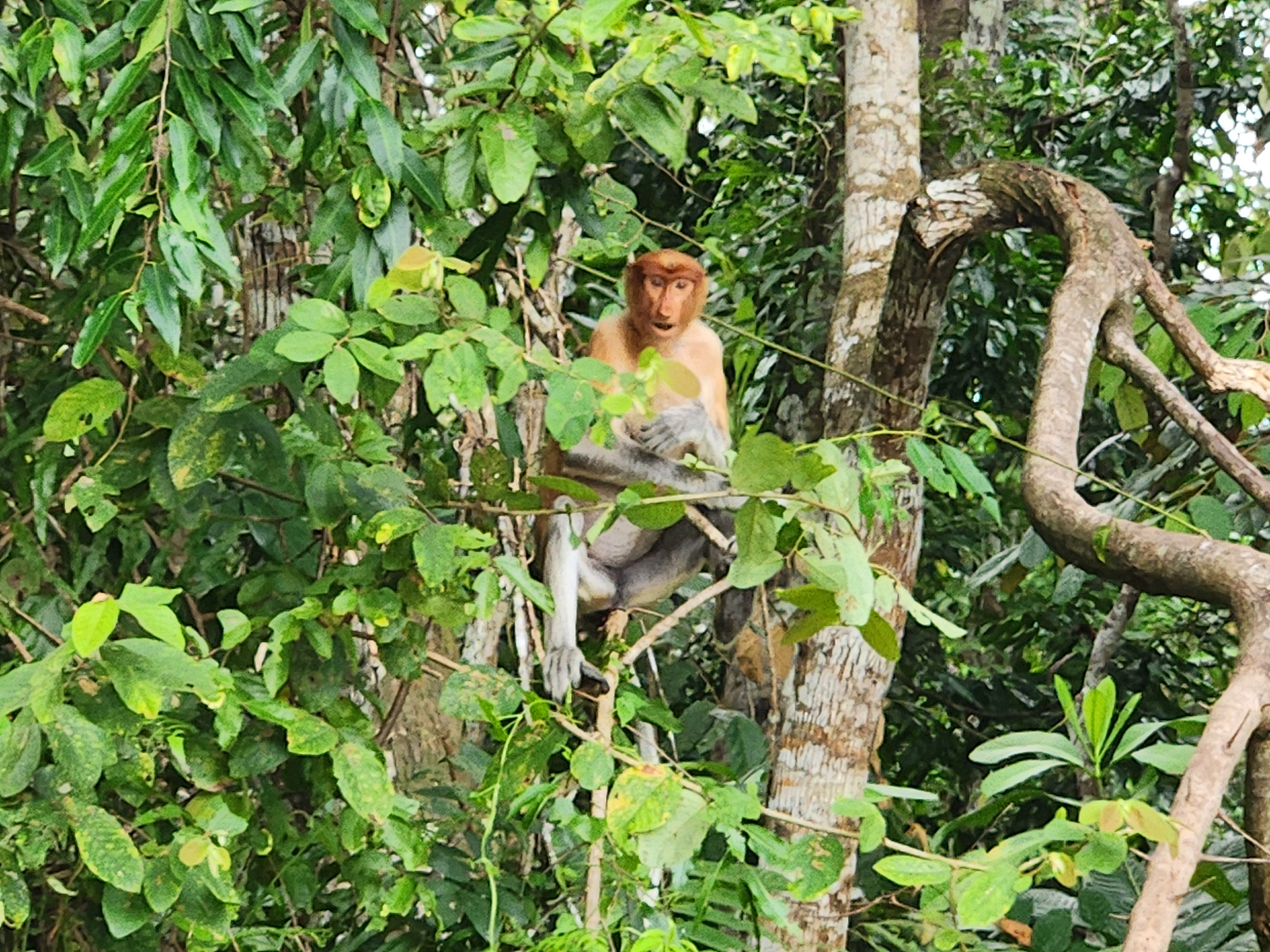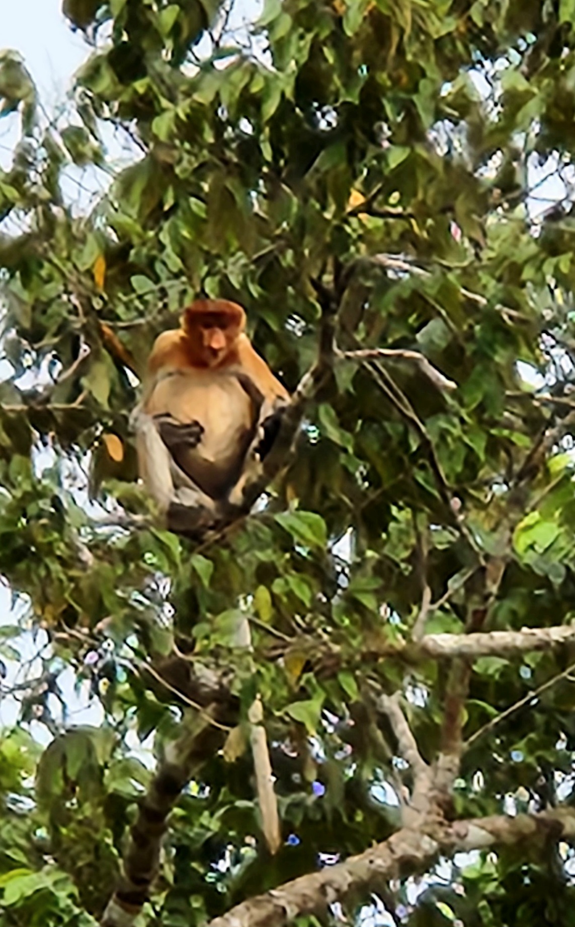 A little further up the river we spotted the first of the Borneo Big 5: the proboscis monkey. The male proboscis monkey with his golden fur and his giant bulbous nose sitting high up in the tree keeping watch over his haren. Only the males grow the big noses starting at the age of about 7 years. Apparently, the female proboscis monkeys find a large nose very attractive. Females and adolescents have pointy noses, which are still cute enough to give them a face that makes you smile. Seeing the proboscis monkeys brought a smile to my face.