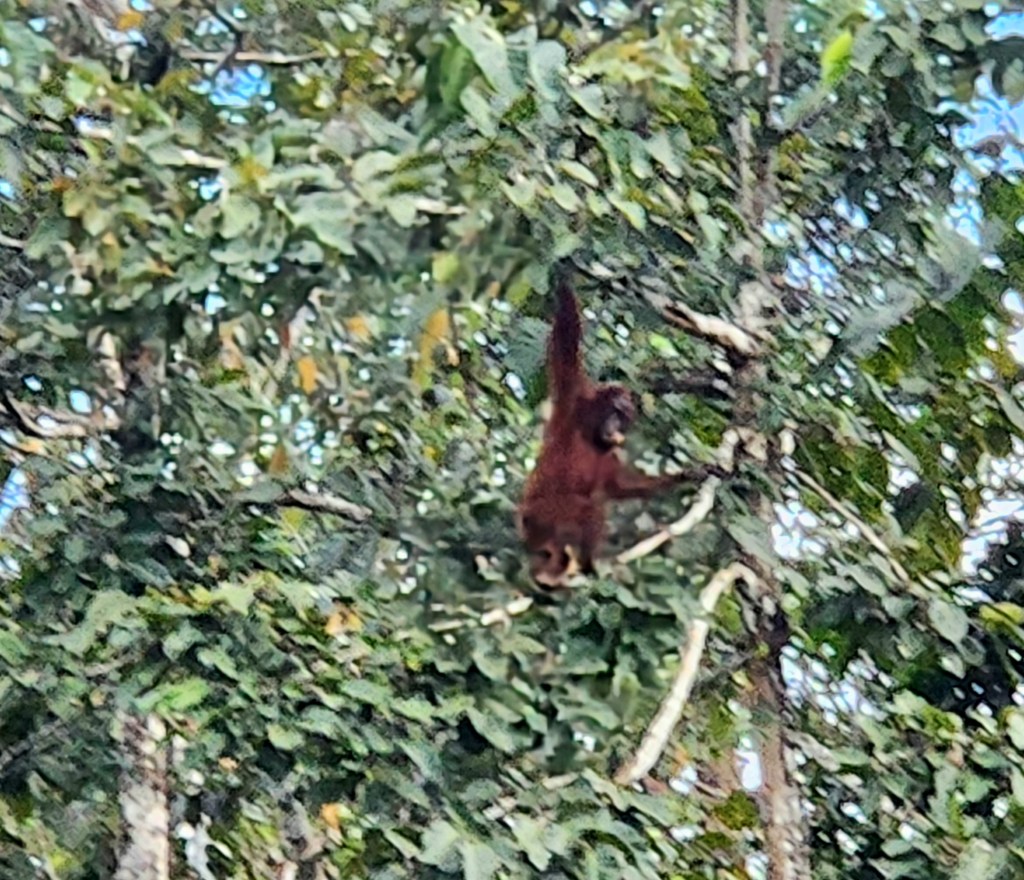 News of a rare sighting had reached our guide and boat driver. The next of the Borneo Big 5: an orangutan. A female orangutan had been spotted in the trees close to the river. She was hard to see because she was just far enough back, but you could see her move through the branches, catching a glimpse of her dark red furry arm as she moved stealthily through the trees. Stopping near the same place as we were returning to the lodge, we were lucky to spot an adolescent orangutan. His more radiant red fur was much easier to see as he moved about and swung from tree to tree. Getting to see an orangutan in the wild was special.