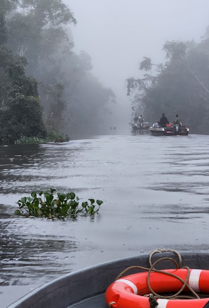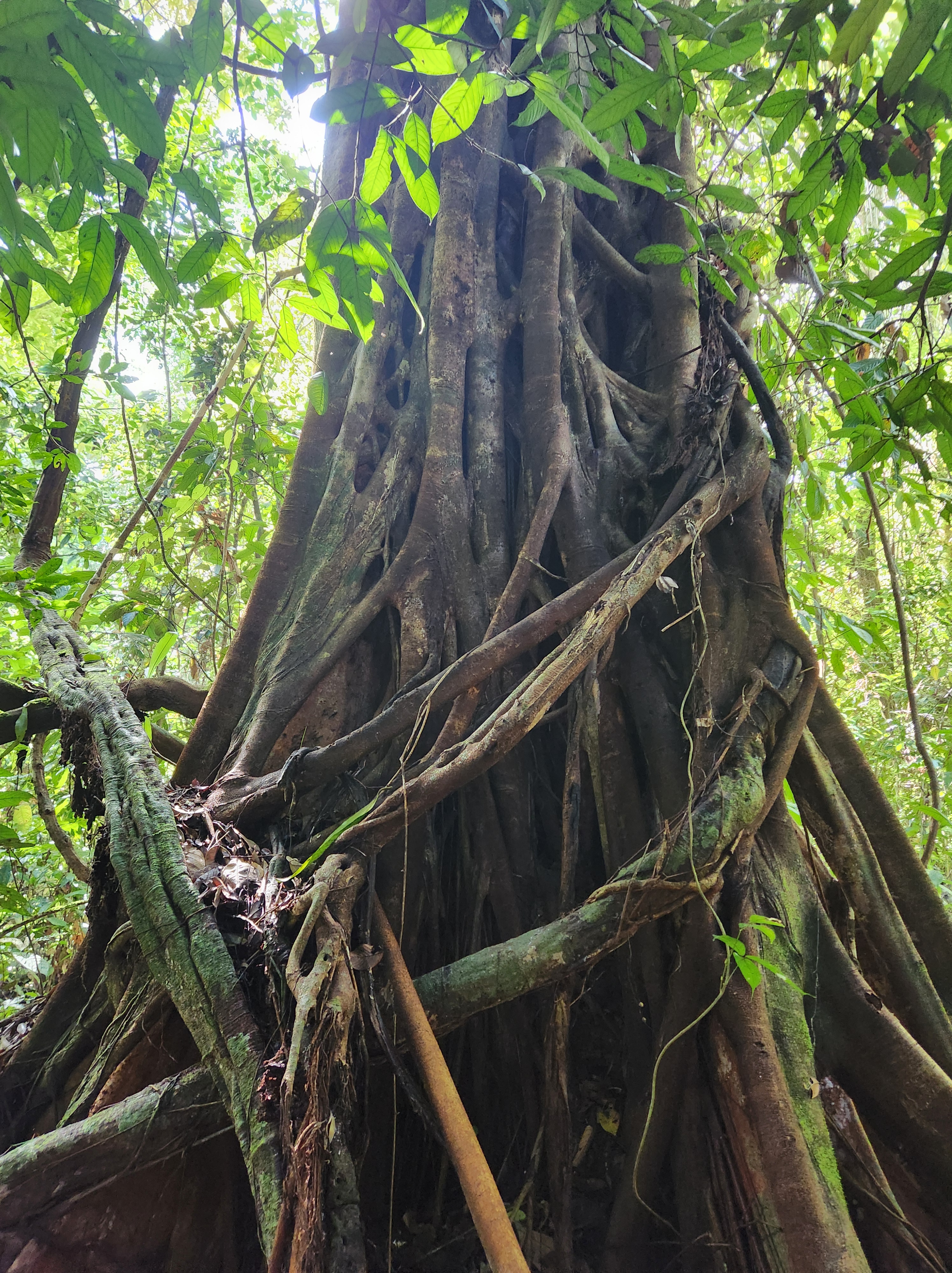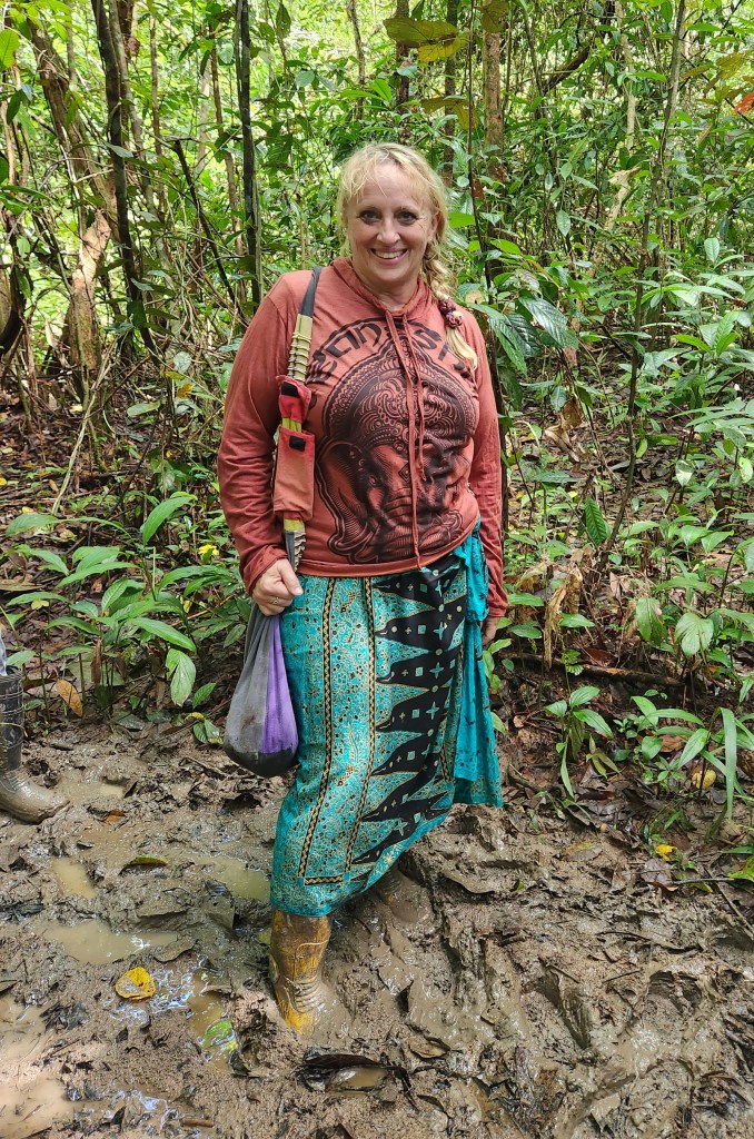 Then it was time to get introduced to the jungle and the creepy crawly things and plants that call it home. A trek through a jungle must be dressed for appropriately given the propensity of leches and mosquitoes to find uncovered skin. Not having the recommended long pants with me, I opted for my turquoise blue with black and gold accents sarong from Bali, long sleeves in the form of my rust color Ganesha hoodie, and yellow wellies (rubber boots). Not everyone can pull off that look. At least the yellow boots drew out the gold in the sarong and the rust orange and turquoise blue were almost complimentary in their colors. Properly dressed and doused in mosquito repellent, we loaded onto the boat and they took us a little bit up river to the opposite bank.