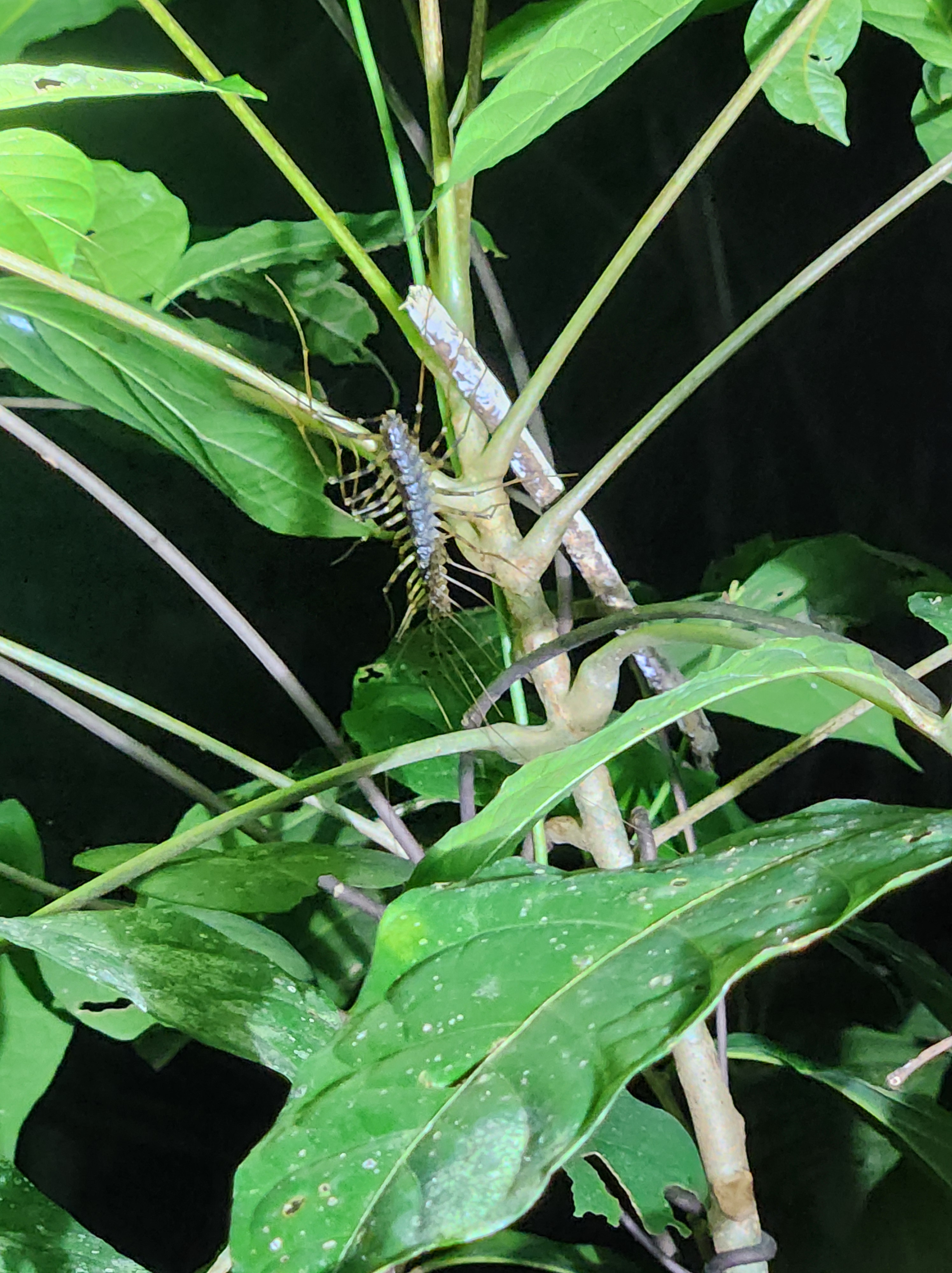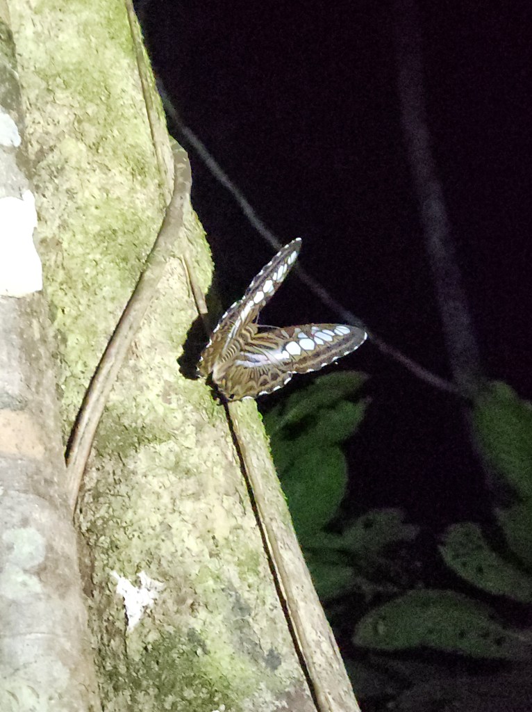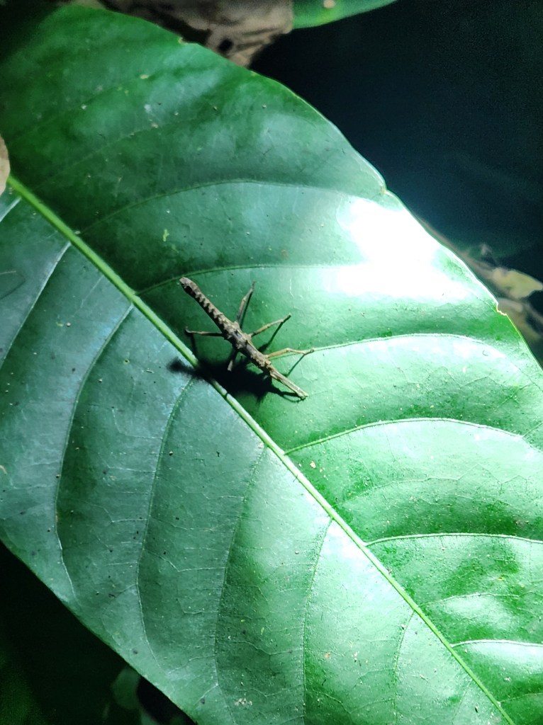 Our last venture into the jungle was a night walk. Covered in clothing and mosquito repellent, wearing our wellies (rubber boots), and armed with torches (flashlights, torches just sounds more cool) we were off into the jungle. This walk is where the small things that could kill you took center stage. The spiky plant that you would not want to grab onto unless you wanted to go to the hospital to have the spines removed one by one. The tree frogs, not colorful but definitely poisonous, the large huntsman spider hanging out on a tree, and the centipede all dangerous. Not everything we saw could kill you. The butterfly that flitted by and landed on a tree, the walking stick hanging out on a leaf, the cicada, and the hammer head slug were more pleasant to find. The soundtrack of the walk was the glopping sound of the boots in the mud and the chirps of the cicadas and frogs. No leeches this time.